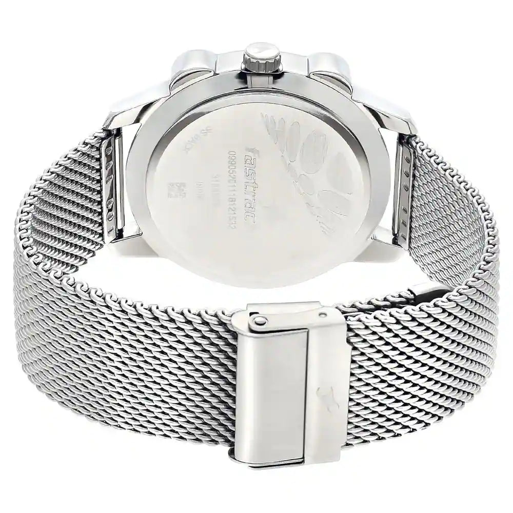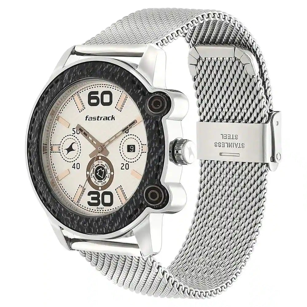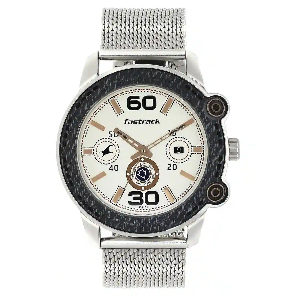 - Fastrack Denim Quartz Analog with Day and Date Watch for Guys With Beige Dial Stainless Steel Strap