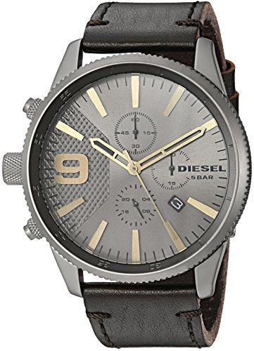 Watch Sizing Guide Without a doubt, you'll be catching everyone's attention with this rugged DIESEL; timepiece. Stainless steel case. Leather strap with contrast stitching and buckle closure. Round face. Three-hand analog display with quartz movement. Gunmetal dial features gold-tone hands and hour markers, three subdials, date display window, minute track, and Diesel detailing. Chronograph functionality. Water resistant 5 BAR. Display case included.