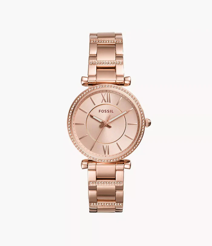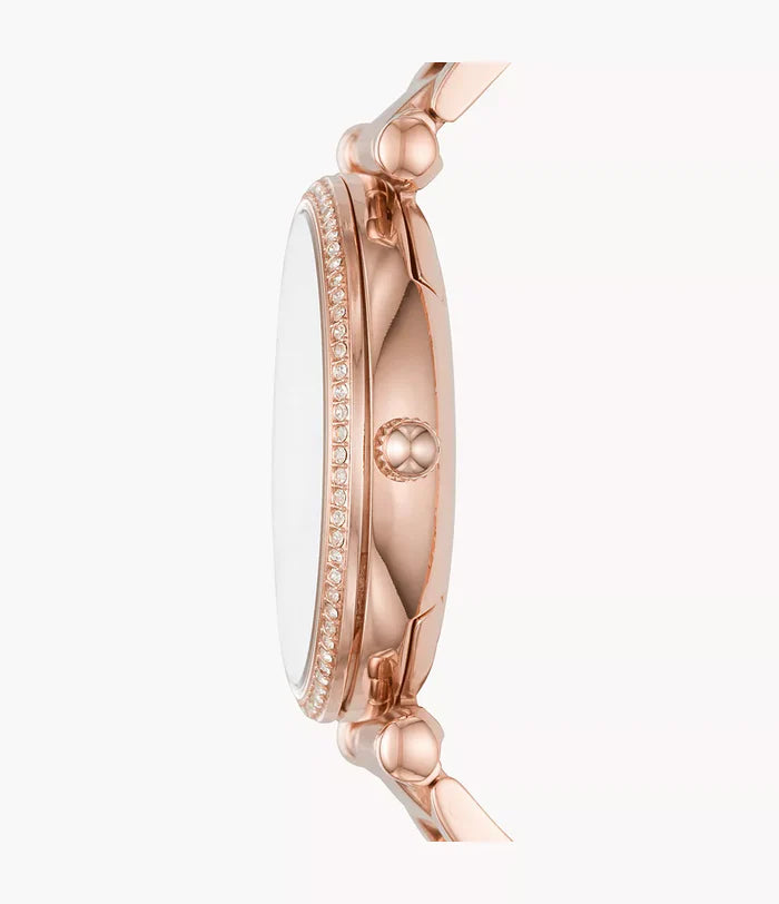 Reference ES4301I Brand Fossil Collection Fossil Dial Size 35 MM Dial Shape Round Case Material Stainless Steel with Rose Gold Coating Diamonds With Swarovski Crystals Strap Bracelet Stainless Steel with Rose Gold Coating Link Bracelet Gender Women Movement Quartz Glass Mineral Glass Water Resistance 5 ATM Brand Warranty 2 Years