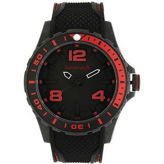 Effectively combining functionality and modern day style, this unisex analog watch from Fastrack's Light Weight collection is a must-have timepiece. The Light Weight collection watches features sturdy case, 3D dial, rugged look, a crown for time adjustment and high-grade silicon strap. But this timepiece showcases a black round dial, plain three hands, number markings at 12th, 4th and 8th-hour markers in red. The black silicon strap with a buckle closure ensures a firm fit on the wrist.