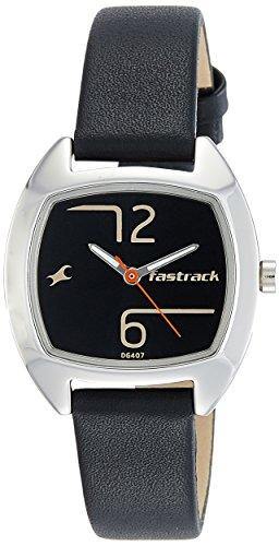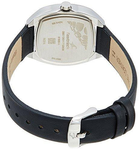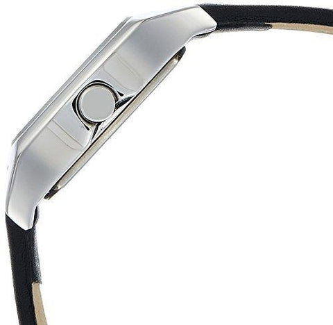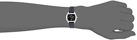 This analog watch for women marks the time in a black dial secured safely within a stainless steel case. It sports Arabic numeral markers at 30-minute intervals to indicate the time. The watch has a black leather strap with a buckle clasp. The water resistance of the watch is 3 ATM.