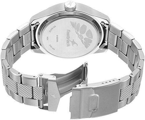 Encompassed in stainless steel, the round black dial of this watch has a minute track, baton indices at every five-minute intervals, and Arabic numeral markers at 15-minutes intervals. Protected by mineral glass, it has a compass needle always pointing to the north. The clous de paris guilloche patterned silver-toned strap of the watch is secured to your wrist with a push-button diver's clasp.