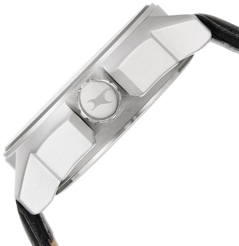 This watch features a multicoloured dial with a grand tapisserie guilloche pattern, which is secured within a stainless steel case and has Arabic numeric indices for both hours and minutes. It is secured with a black leather strap and a buckle. It resists water up to 5 ATM and comes with a 24 month warranty.