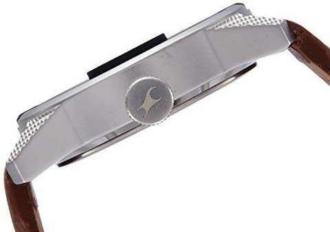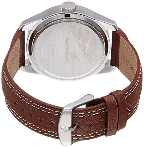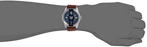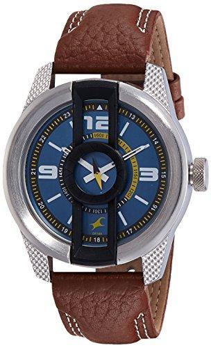 This analog watch for men has a blue dial enclosed within a round, brass case. Three Arabic numerals at quarter intervals and silver slanted marks facilitate easy time reading. A black coloured section projects from the dial which displays plain three hands. The watch has brown leather straps. A silver crown lets you adjust the time easily. A buckle closure secures the watch. The watch comes with a 5 ATM water resistance.