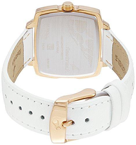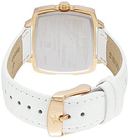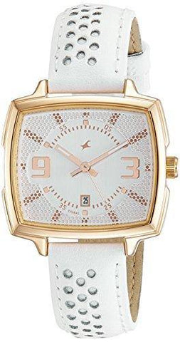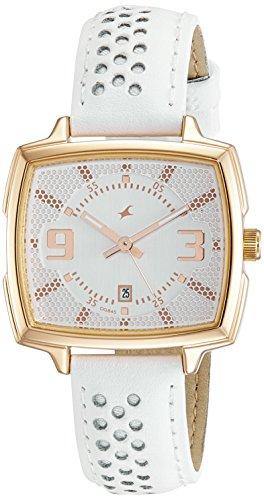 This dazzling analog watch has a gold toned outer case. It has three hands and Arabic numerals placed on both the hourmarkers and minutemarkers to denote the time. There is a date window on the 6th hourmarker position as well. The watch secures with a white perforated leather strap. It also arrives with a water resistance of 3 ATM.