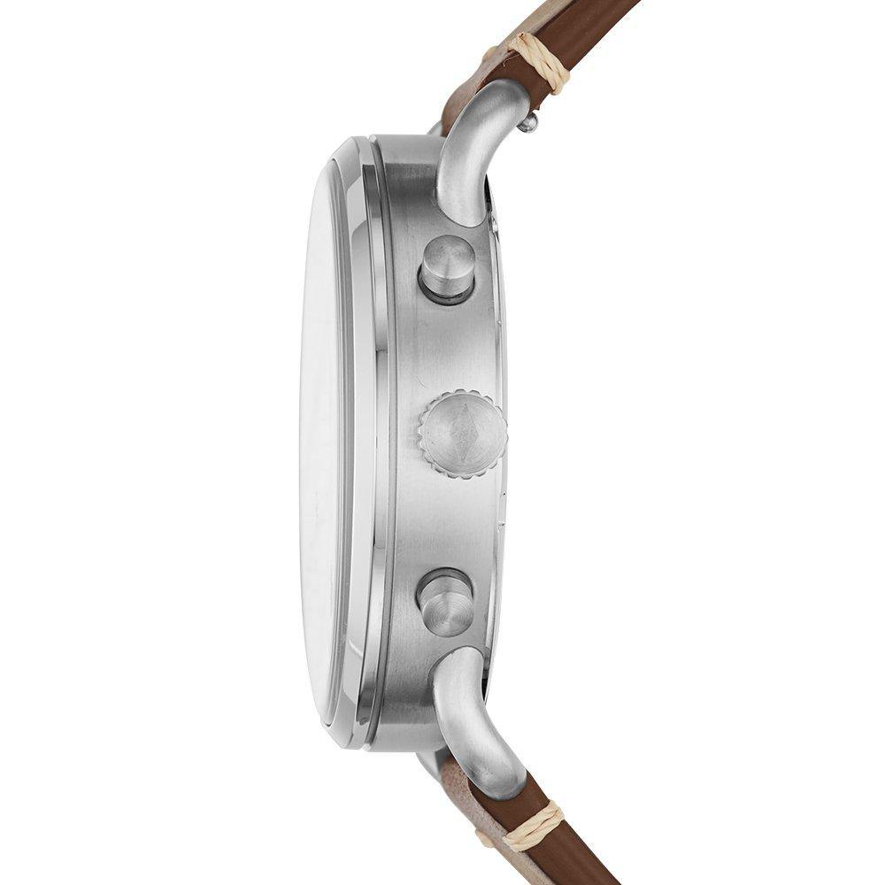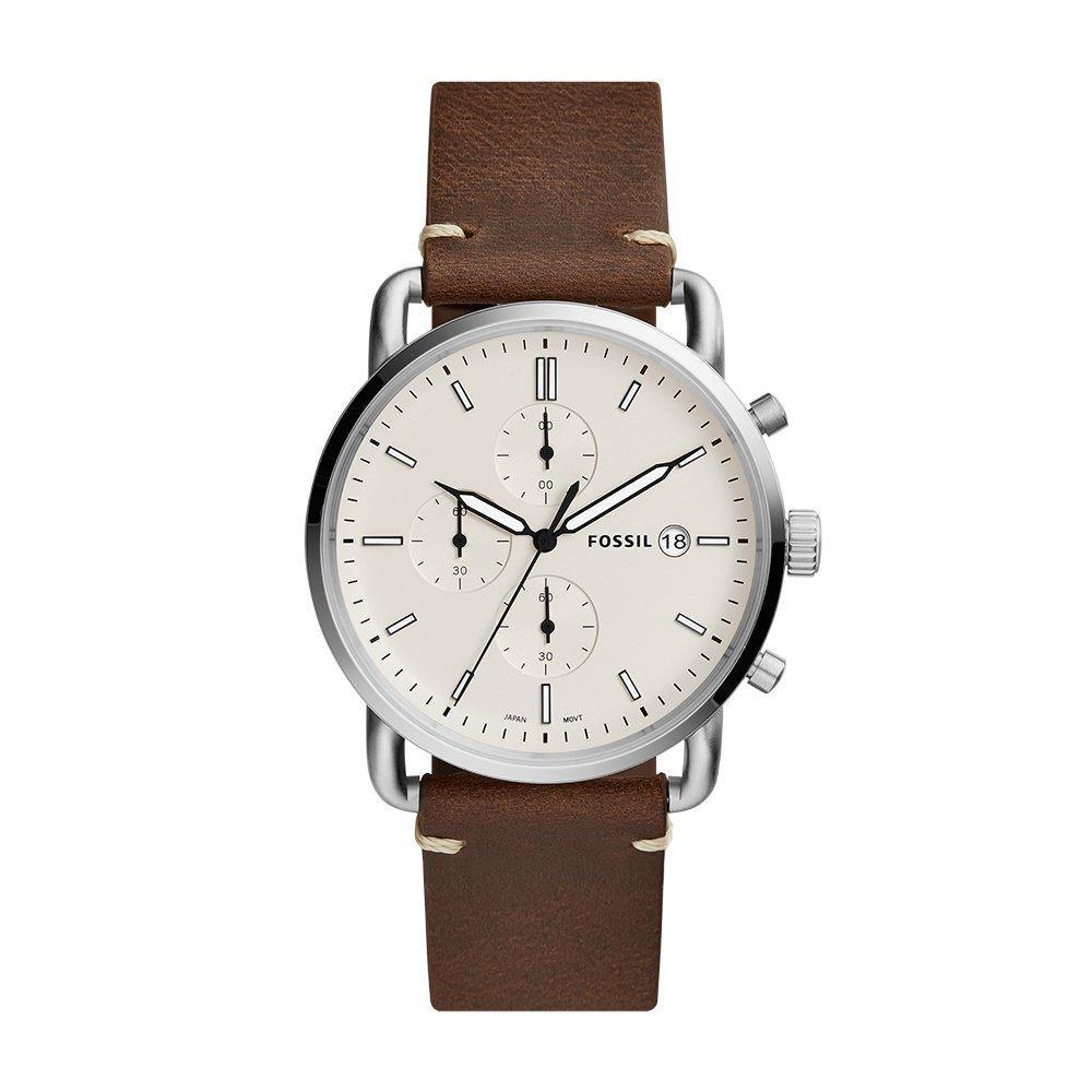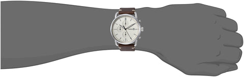 This modern and chic chronograph watch by Fossil comes in a brushed silver steel case that is durable and at the same time compliments the look of the watch. The cream dial has three sub-dials, a date window with three crowns on its side that adds to the character of the piece. The dial, with its whited toned hands boredered with black is paired with a brown leather strap that is fastened with a silver prong buckle. Adorn your wrist by wearing this timeless piece again and again.