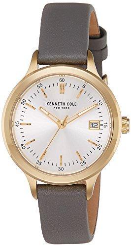 Add a stylish dimension to your look by wearing this women's analog watch from Kenneth Cole. The white round dial vaunts plain three hands, bold stick and numeral markings at five-minute intervals, a date display window and a crown for time adjustment. The genuine leather strap exudes a grey hue that accentuates the look of the timepiece. Moreover, it is fitted with a buckle clasp that ensures a secure fit on the wrist.