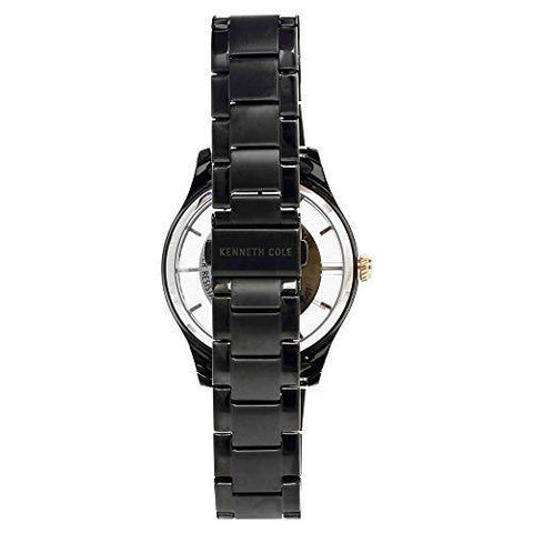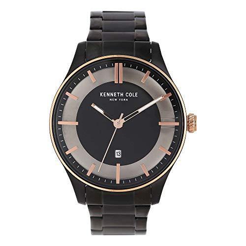 Add the perfect finishing touch to your look with this men's analog watch from Kenneth Cole. Its stainless steel strap showcases a stunning black hue that uplifts the look of the watch. Protected by a mineral glass, the black round dial showcases plain three hands, stick indices at five-minute intervals, a date display window and a crown for time adjustment. Furthermore, it is complemented with a push-button clasp that ensures a secure fit on the wrist.