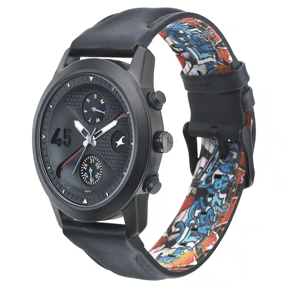 - Fastrack Go Skate Quartz Multifunction Watch for Guys With Black Dial Leather Strap