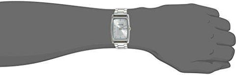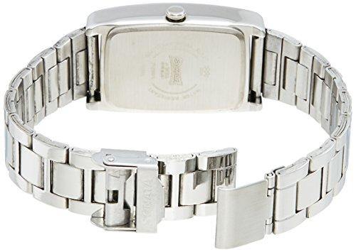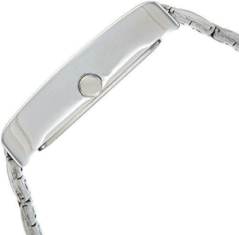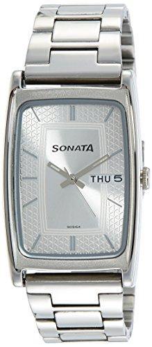 This analog watch for men has a silver rectangle dial, encompassed within a brass case. The dial has plain three hands with patterned borders. The date and day are displayed beside the three Oclock position. A silver crown lets you adjust the time display. Made of metal, its silver strap is secured with a three-piece sliding clasp closure. The timepiece is user-friendly as it comes with a 3 ATM water resistant feature and with a 12-month warranty.