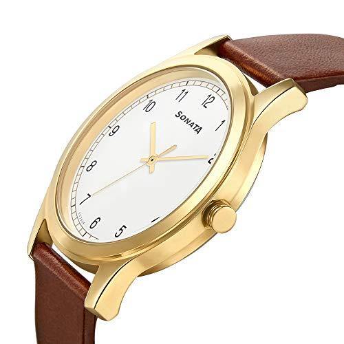 This analog watch for men has a round dial of White colour. The dial has plain three hands operated by quartz movement. It has a brass casing and a crown to adjust the time. The strap is secured by a buckle. The watch has a water resistance up to 3 ATM and comes with a 12 month warranty.