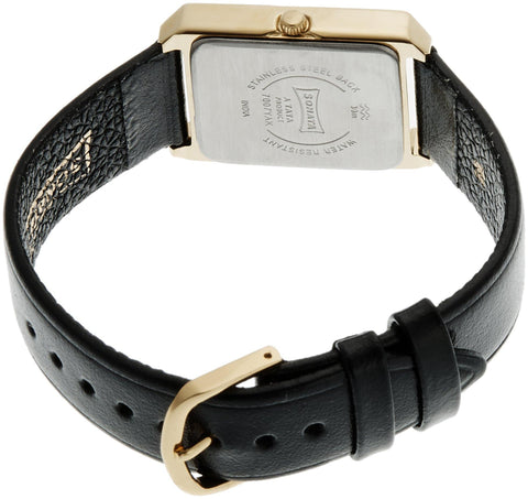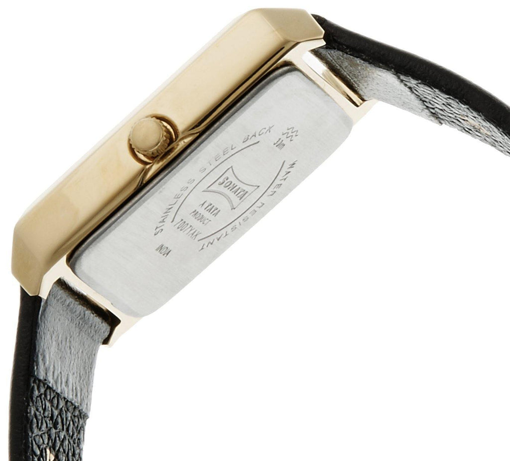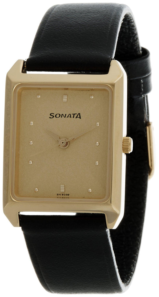 Upgrade your accessory collection with this men's analog watch from Sonata. Functional on a quartz movement, the golden rectangular dial vaunts plain three hands, markings at five-minute intervals and a crown for time adjustment. Made of genuine leather, its black strap is fitted with an adjustable buckle closure. Team this water-resistant timekeeper with a white shirt to look dapper.