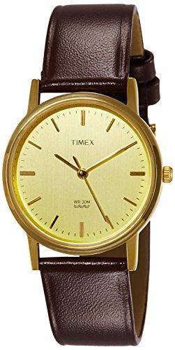 Timex Classic Analog Gold Dial Men's Watch comes with a brown strap which is made of pure leather and is sure to serve a long time even after regular use. This regular watch comes with a 7.5mm thick back-case which is made of stainless steel. The diameter of the back-case is 35millimetres. The lugs and the bezel are golden in colour just like the face of the dial which holds the same base shade. The hours are indicated on the dial by stick markers. For additional authentication, the brand logo is printed in black just below the 12-hour mark. Since this watch is designed for regular use, it is expected to go through wear and tear. To ensure that the dial doesnt get tampered in any way, a tough crystalline glass is there at the top as a cover for the dial. On top of everything, this quartz-run wrist-watch is water-resistant and remains unaffected up to 30meters under the water. Buy this elegant piece of wonder and travel back to the vintage years.