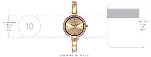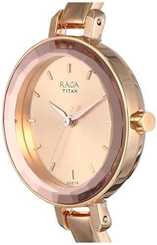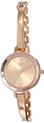 Encased in stainless steel, the dial of this watch by Titan Raga is rose gold-toned and round in shape. It displays a sunray finish and marks the time with applique baton indices placed at five-minute intervals and three sleek hands. The bezel of the watch has a hammered texture that adds to the look of the watch. It finishes with a rose gold-toned stainless steel strap securing with a jewellery clasp.
