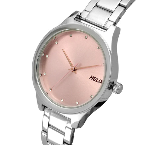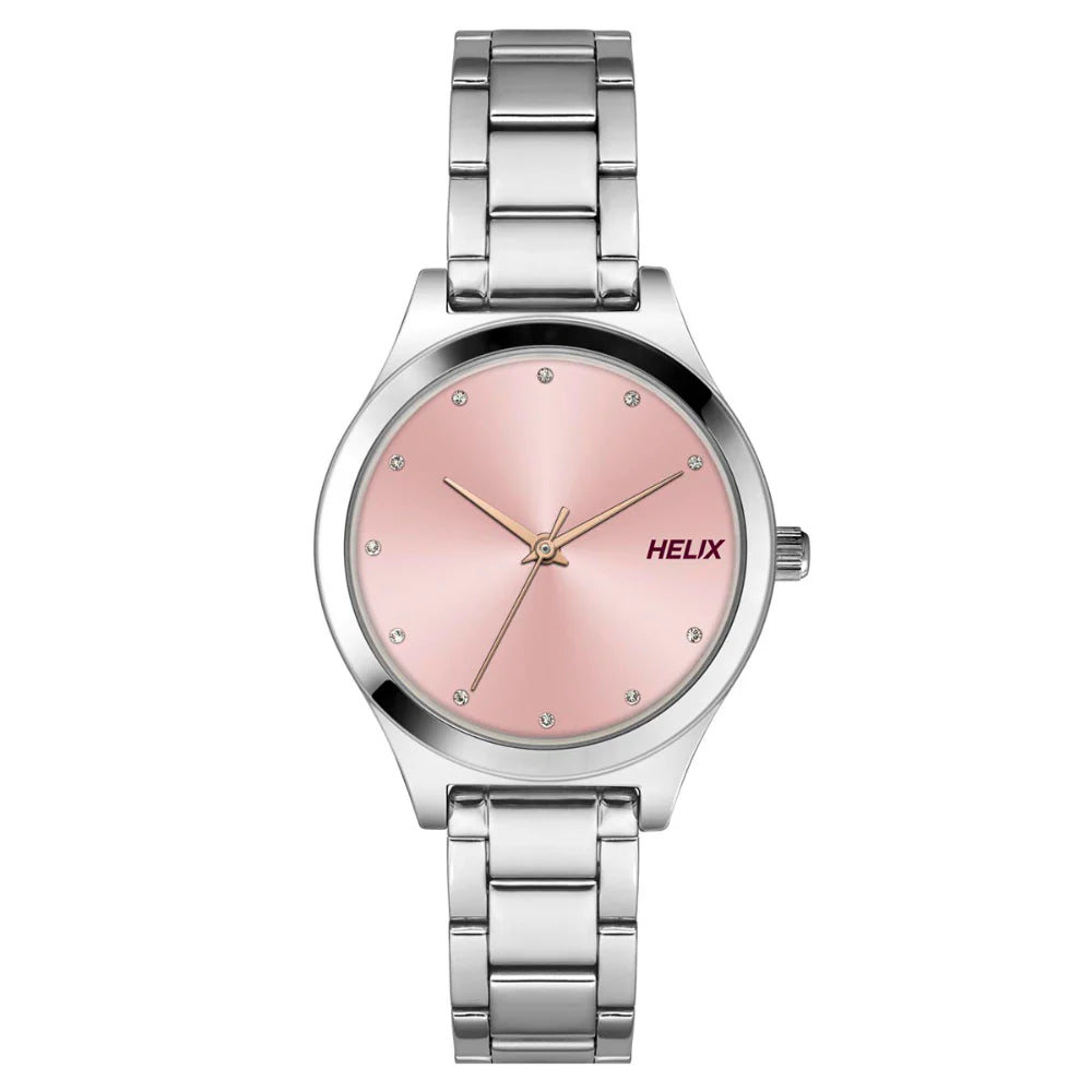 Product : TW049HL08 Brand : Helix Case material : Brass Case thickness : 8.8MM Case width : 33.5MM Country of origin : A gentle wipe with a clean soft dry cloth when nee Dial color : Pink Dial shape : Round Display type : Analog Gender : Women Movement : Quartz Analog Net quantity : 1 N Package contains : 1 Watch with warranty card Strap color : Silver-Tone Strap material : Stainless Steel Strap type : Bracelet Strap width : 14MM Warranty years : India Watch care : Watch Water resistance : 30 meters