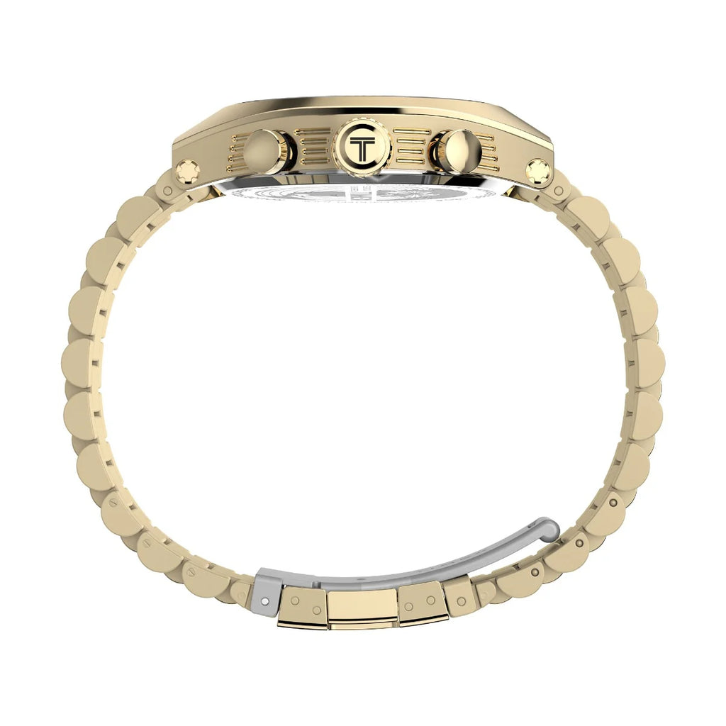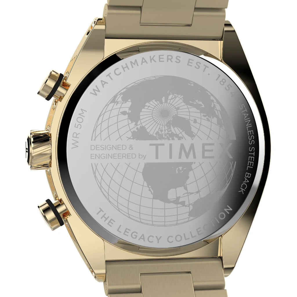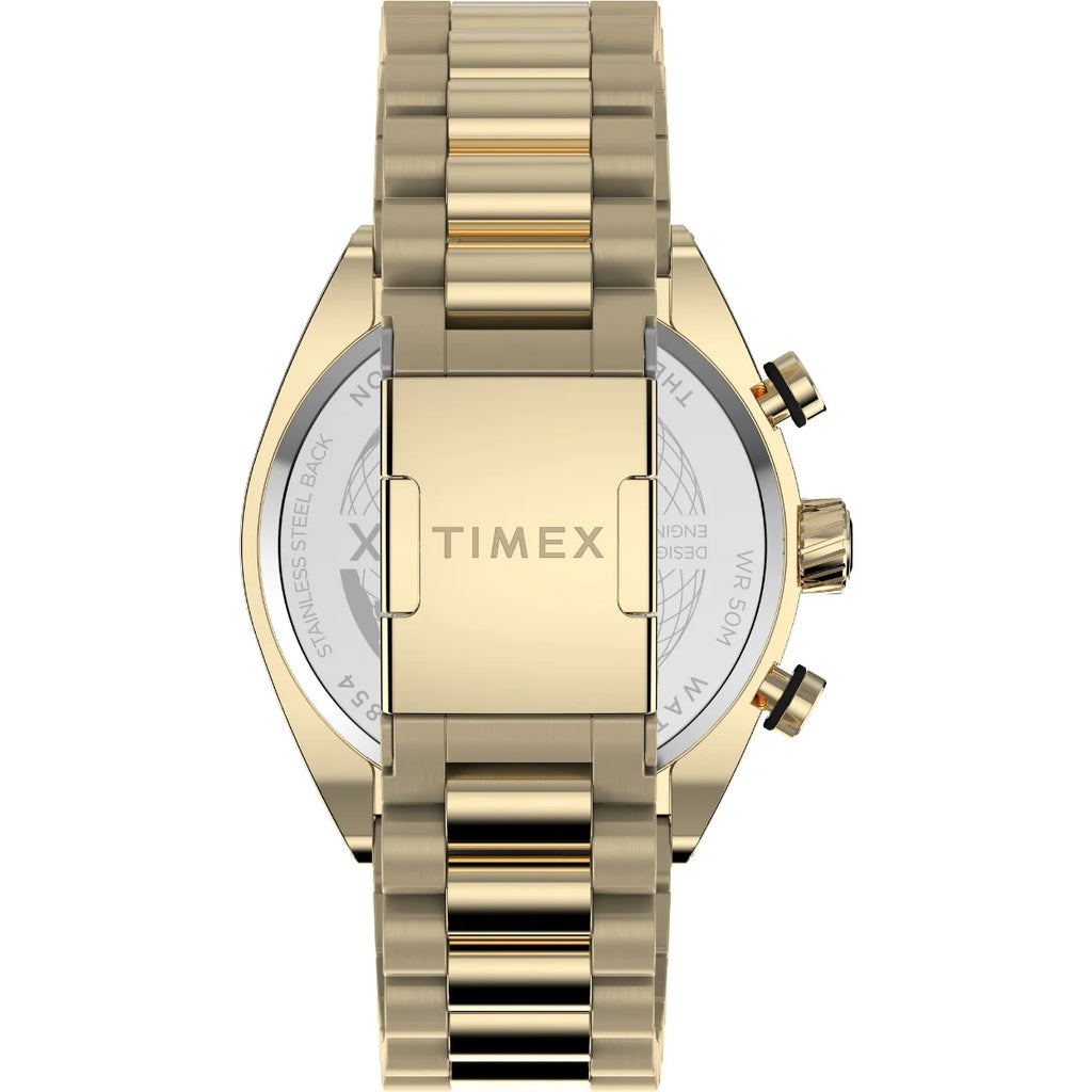 Watch : TW2W22100UJ Case material : Gold - Tone Case thickness : 11 mm Case width : 42 mm Classification : Timex Global Watch Country of origin : Canada Dial color : Black Display type : Analog Watch Glass material : Mineral Glass Power source : Battery Scratch resistance : No Season : Fall 2023 Shock resistance : No Strap color : Gold Strap material : Stainless Steel Strap width : 22 mm Warranty years : 1 year warranty against manufacturer defect Watch movement : Quartz Analog Water resistance : 50 meters Gender : Men Net Quantity : 1 N