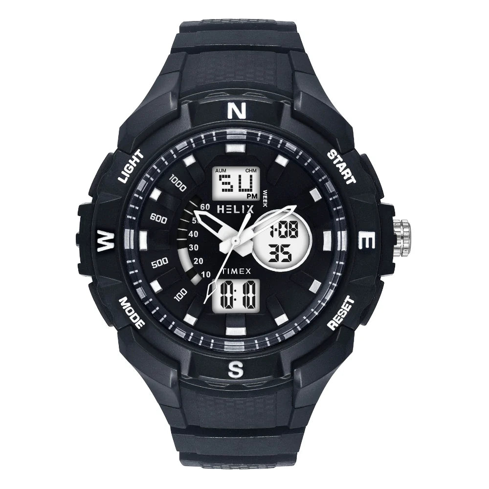 Product : TWESK4600T Brand : Helix Case material : Resin Case thickness : 16MM Case width : 50MM Country of origin : A gentle wipe with a clean soft dry cloth when nee Dial color : Black Dial shape : Round Display type : Ana Digi Gender : Men Movement : Quartz Analog-Digital Net quantity : 1 N Package contains : 1 Watch with warranty card Strap color : Black Strap material : Resin Strap type : Strap Strap width : 20 mmMM Warranty years : China Watch care : Watch Water resistance : 50 meters
